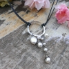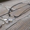From the focal circle hang several charms & dangles of varying lengths and dimensions, all in complementing pearls. The color options are: Pink Pearl, White Pearl (shown) or Grey Pearl.