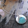 Hammered and highly polished, the sterling silver disc measures 3/4 inches across. One Grade A, Mystic Chalcedony briolette in the creamiest of sea-greens dangles in the center of the disc. Because the Chalcedony is so luminous, the sterling nearly glows with the reflection. Pendant shown hammered and without oxidation - finish is bare & shiny, but can be oxidized upon request.