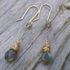 Labradorite gemstone earrings are created using 14K gold filled wire (in my signature wonky wrap) to secure these beautiful briolettes to heavily oxidized sterling chain. A lovely little (4mm) Labradorite rondelle serves to connect the sterling chain to the handforged 14KGF earwire. The blue flash is very desirable and strikes a bold contrast to the 14K gold filled wire.
