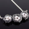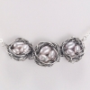 A trio of pink pearls, each approximately 4mm in size, is held snuggly in a nest of oxidized sterling silver wire. Three individual nests are then linked together to form a lovely, organic pendant. Each nest is approximately 5/8 inches across, and the pendant is secured on both sides to a sterling silver chain which adjusts from 16 to 18 inches.