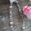 The randomly strung freshwater pearl beads range in colors from pinky-beige to pale shell pink. A variety of Swarovski crystals in complementary colors and shapes add sparkle and a little bit of "bling" to the elegant pearls. I mix it up with a generous amount of sterling silver, and finish with a lobster clasp & soldered sterling ring.