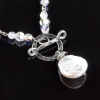 A 10+mm Freshwater Coin Pearl has been abundantly wrapped in oxidized sterling and dangles sweetly from the toggle clasp.