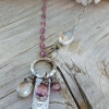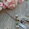 Gorgeous, faceted Pink Tourmaline Gemstones are linked by hand using oxidized sterling silver wire. Each 4mm faceted gemstone is securely attached to the next, meeting at the nape of the neck with oxidized sterling chain. A single AAA Grade Quartz Crystal barrel secures the chain to the clasp and create a funky, asymmetrical look. An array of gemstones - quartz crystal, pink sapphire, pink quartz - dangle freely from the hammered circle. I've also added a handstamped sterling medallion (approximately 8mm x 25mm) which says, "dream big." This piece can be stamped with any variety of letters or numbers, up to 9 characters. (See my "forever" listing for color / stamping variations.) The charms provide a nice weight and ensure a secure fit.