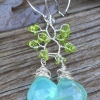 The piece shown is created with little (3 - 4mm) faceted Vesuvenite rondelles in a bright green and sterling silver. The gorgeous, sea green-blue Chalcedony briolette measures approximately 10mm across, and catches the light beautifully with each movement. (As a SCUBA diver I especially love how Chalcedony is so reminiscent of sea glass.) From the top of the handforged sterling earwires, the overall length is approximately 2.5 inches.