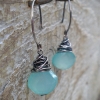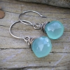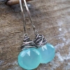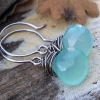 Beautiful, translucent Chalcedony in a sea-blue-green color have each been bound in nearly a foot of sterling silver wire. The perfect mix of casual spunk and dress-up glamour, these earrings have quickly become one of our most popular! The Chalcedony has a lovely, nearly milky quality to the stone.