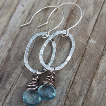 For a rustic, slightly industrial look, I've paired my signature wonky wrap with a hammered & lightly oxidized loop from which the gemstone dangles freely. (It was fun photographing these in the Northern California wind today - they sure love to sway!)