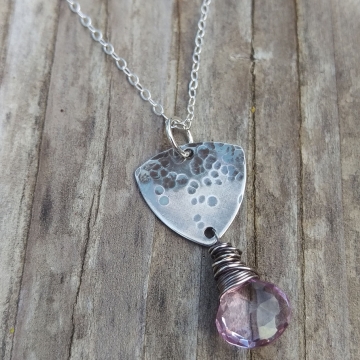 Shield Necklace in Hammered Sterling with Pink Quartz Brioletted Finished with Wonky Wrap - Sterling Chain, Adjustable