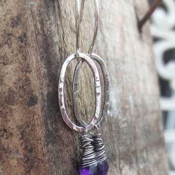 Textured Sterling Oval & Amethyst Briolette Charm Earring