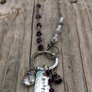 Garnet and Quartz Crystal Gemstones Linked with Sterling Wire - Handforged Clasp, Hand-stamped Medallion & Gemstone Charms