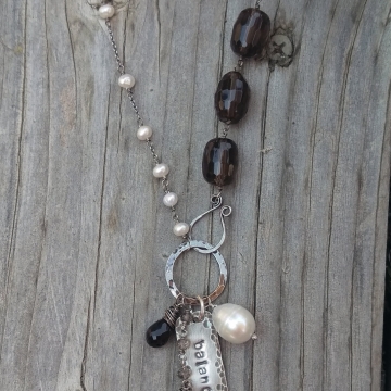 Smoky and Clear Quartz Crystal Gemstones Linked with Sterling Wire - Handforged Clasp, Hand-stamped Medallion & Gemstone Charms