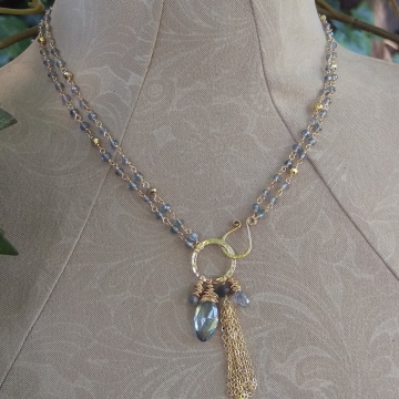 Blue Quartz Rosary Link Convertible Charm - Fringe Necklace - Wear Two Ways!