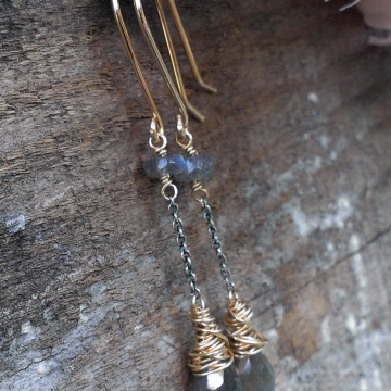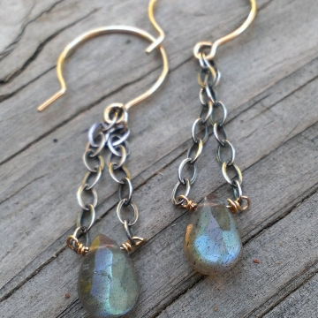 Mixed Metal Labradorite Earrings- Labradorite Briolettes wrapped in 14KGF Wonky Wrap on Oxidized Sterling Chain