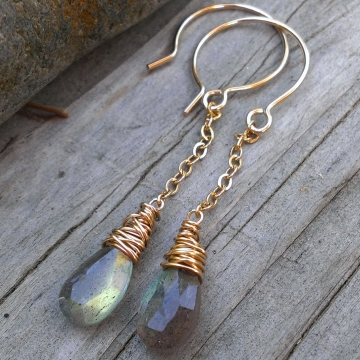 Labradorite Earrings in 14K Gold Fill - Labradorite Briolettes hang from 14KGF chain with Wonky Wrap detail