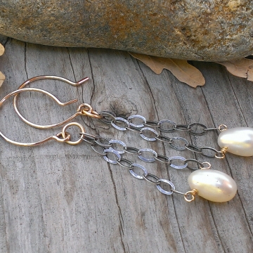 Cream Pearl Earrings - Mixed Metal (sterling & 14KGF) with Pearl Drop - handforged