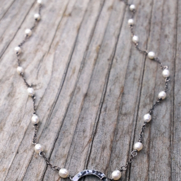 Pearl Station Necklace with Hammered Circle Focal Link, handforged sterling, adjustable