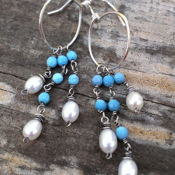 Sleeping Beauty Turquoise & Pearl Cascade on Handforged Sterling Hoop Earrings